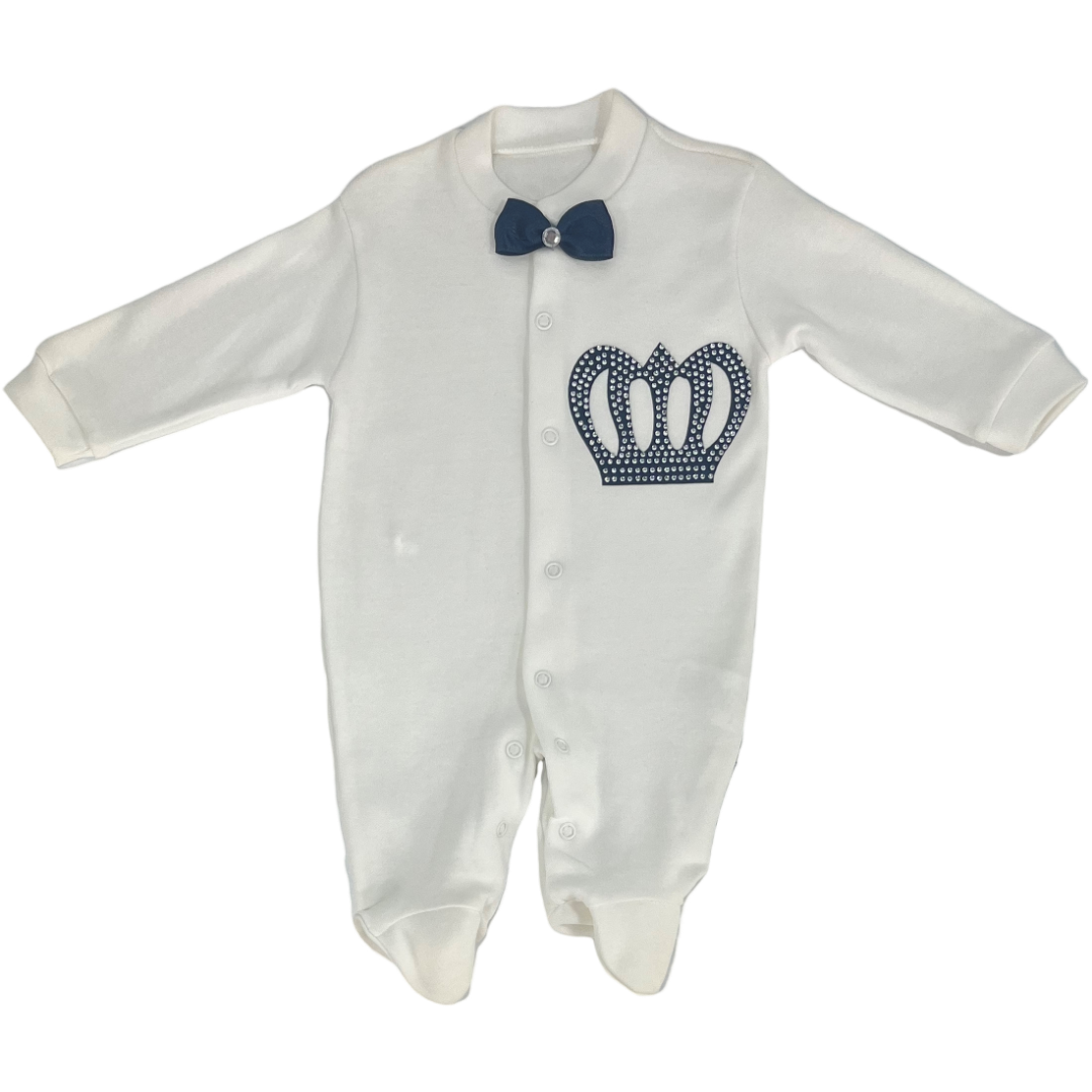 Κομψό και άνετο βρεφικό φορμάκι για αγόρι, σε διαχρονικό λευκό χρώμα, ιδανικό για ξεχωριστές εμφανίσεις. Διακοσμείται με εντυπωσιακή κορώνα από στρας στο στήθος και υφασμάτινο παπιγιόν, χαρίζοντας στυλ και μοναδικό χαρακτήρα.