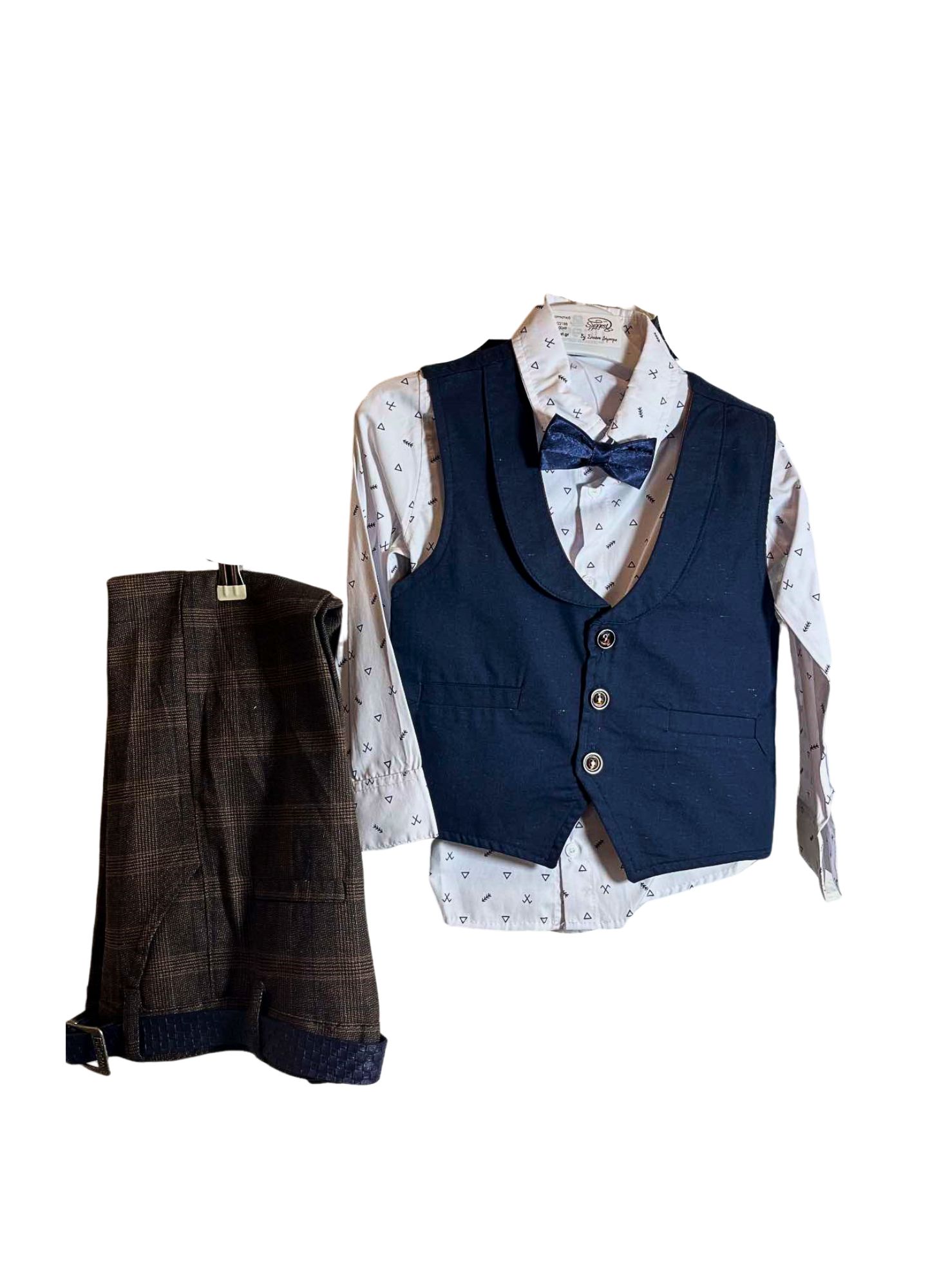 Αναδείξτε το στυλ του μικρού σας με αυτό το κομψό παιδικό κουστουμάκι για αγόρι, ιδανικό για βάπτιση, γάμο ή κάθε ιδιαίτερη περίσταση. Το σετ περιλαμβάνει ένα λευκό πουκάμισο με μοντέρνο γεωμετρικό μοτίβο, συνδυασμένο με μπλε γιλέκο υψηλής ποιότητας και ασορτί παπιγιόν για ξεχωριστή εμφάνιση. Το καρό παντελόνι σε γήινους τόνους ολοκληρώνει το σύνολο με διακριτική κομψότητα και άνετη εφαρμογή.