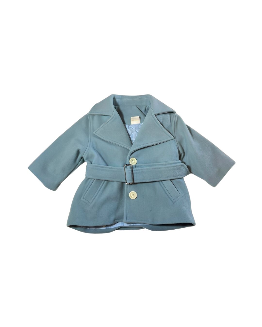 • Καπαρντίνα σε γαλάζιο χρώμα με ζώνη και κουμπιά σε αντίθεση, ιδανική για ανοιξιάτικες ή φθινοπωρινές βαπτίσεις.