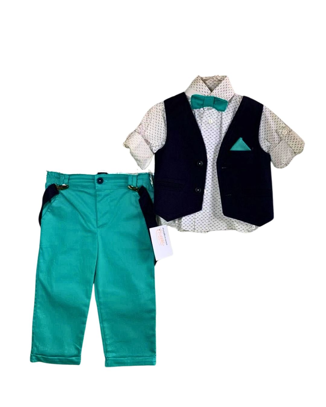 Ένα εντυπωσιακό, χαρούμενο και μοντέρνο σύνολο για αγόρι, ιδανικό για καλοκαιρινή ή ανοιξιάτικη βάπτιση. Οι ζωντανές αποχρώσεις του τιρκουάζ συνδυάζονται άψογα με το κλασικό μπλε σκούρο, δημιουργώντας ένα ξεχωριστό outfit με χαρακτήρα και στυλ.