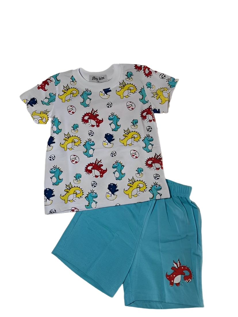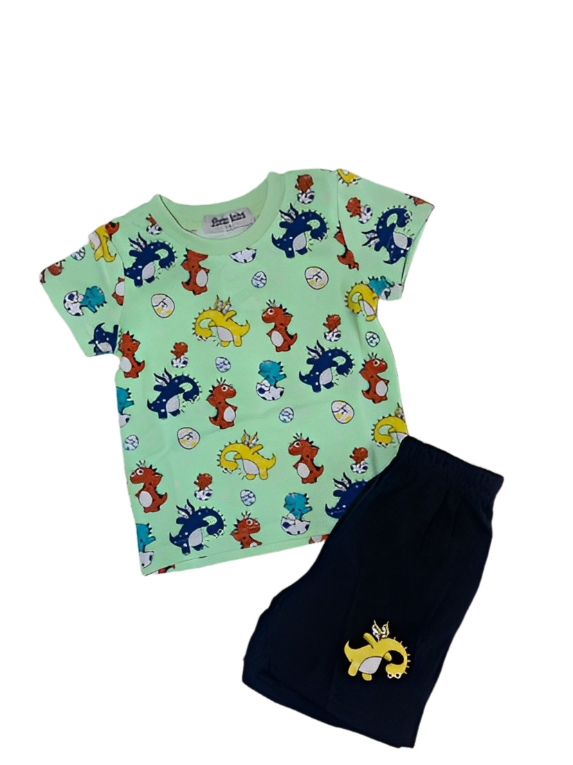 Ένα παιχνιδιάρικο και πολύχρωμο σετ ιδανικό για καθημερινή χρήση και καλοκαιρινές εξορμήσεις. Το μπλουζάκι είναι σε φωτεινό πράσινο φόντο με ζωηρά σχέδια από δεινοσαυράκια σε διάφορα χρώματα, που ξετρελαίνουν τα παιδιά. Το σύνολο ολοκληρώνεται με μαύρο σορτς που φέρει διακριτικό κεντημένο σχέδιο δεινόσαυρου στο πλάι.