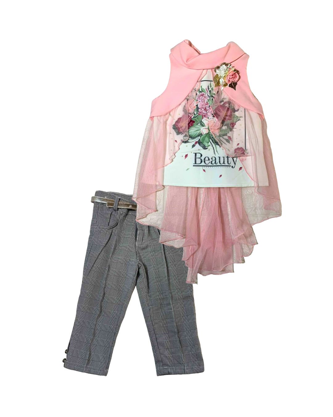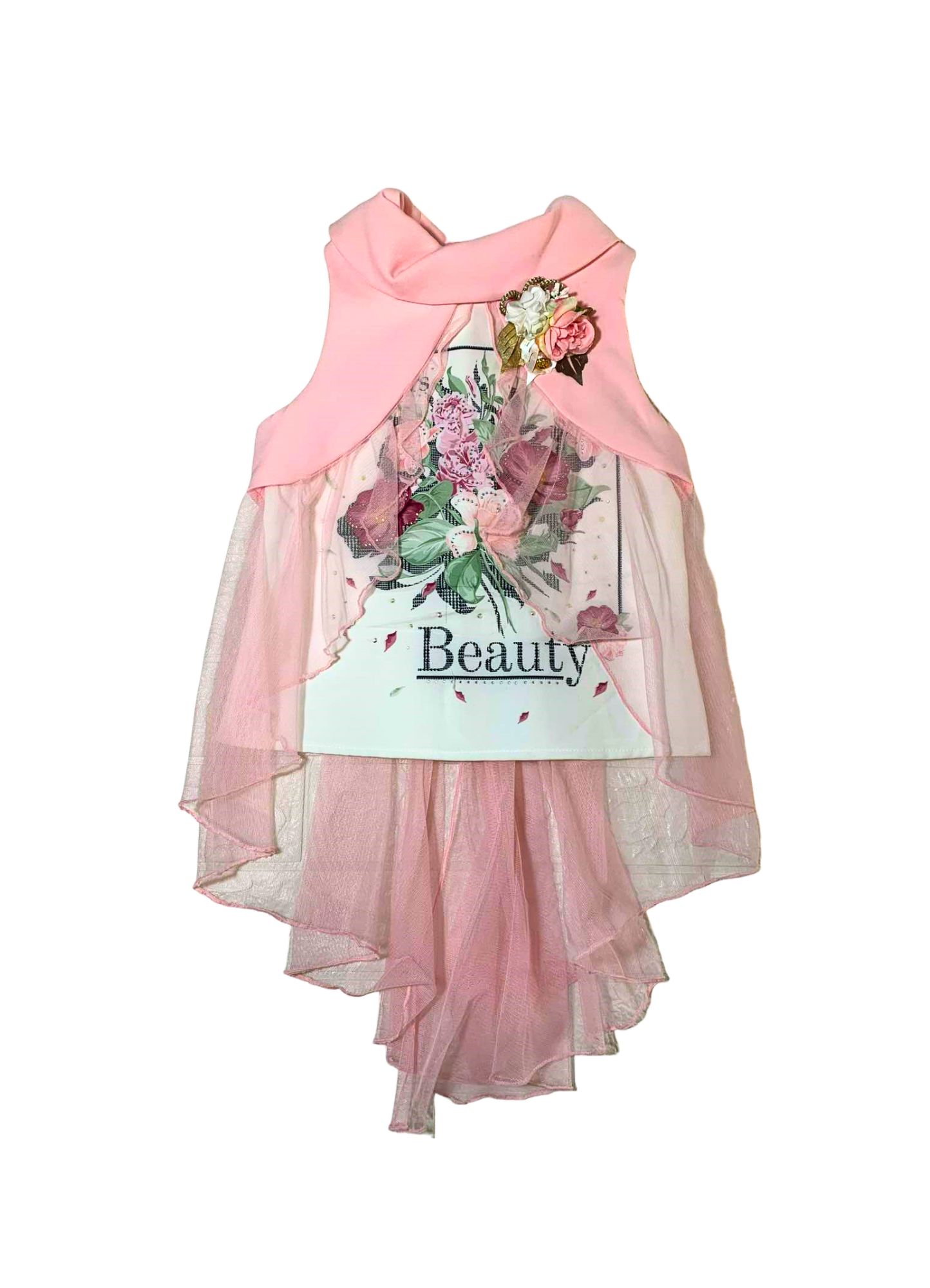 Αναδείξτε το στυλ της μικρής σας με αυτό το υπέροχο και κομψό παιδικό σετ για κορίτσι, ιδανικό για γιορτινές εμφανίσεις, εκδηλώσεις και ιδιαίτερες στιγμές. Το σύνολο περιλαμβάνει μια εντυπωσιακή ροζ μπλούζα με αέρινο τούλι και όμορφη floral στάμπα “Beauty”, που προσφέρει ρομαντισμό και ανάλαφρη κίνηση. Διακοσμημένη με λουλουδένια λεπτομέρεια στον ώμο, προσθέτει μια μοναδική πινελιά κομψότητας.
