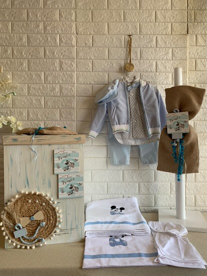 • 👕 Ρούχο βάπτισης με ιδιαίτερο πουκάμισο, διακοσμημένο με παιχνιδιάρικα σχέδια ή λεπτομέρειες, συνδυασμένο με σιέλ παντελονάκι και ανοιξιάτικο πανωφόρι σε ελαφρύ ύφασμα – μια εμφάνιση που συνδυάζει στυλ και ανεμελιά