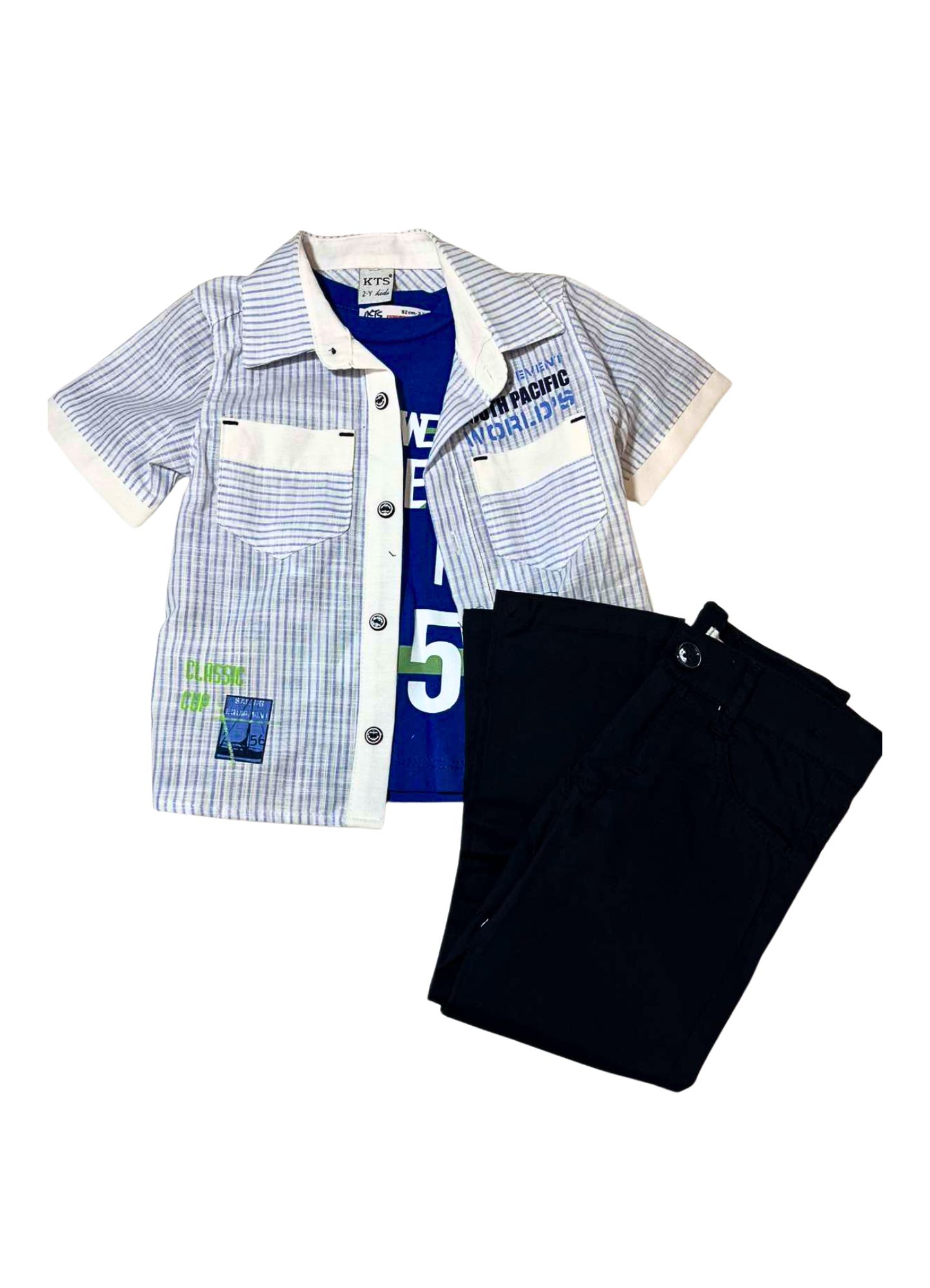 Μοντέρνο και πρακτικό σετ για αγόρι, ιδανικό για όλες τις ώρες της ημέρας. Το σετ περιλαμβάνει κοντομάνικη μπλε μπλούζα με σχέδιο, που συνδυάζεται αρμονικά με λευκό κοντομάνικο πουκάμισο με μπλε ρίγες για κομψό layering look. Ολοκληρώνεται με μαύρο τζιν παντελόνι, άνετης εφαρμογής, για μοντέρνο και στυλάτο αποτέλεσμα σε κάθε εμφάνιση.