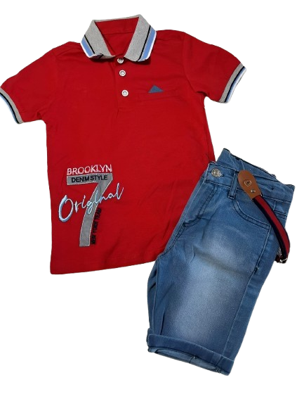 Μοντέρνο και άνετο καλοκαιρινό σετ για αγόρι που συνδυάζει κομψότητα και σπορ στυλ! Περιλαμβάνει κόκκινη μπλούζα τύπου πόλο με γιακά και διακριτικά κεντήματα, καθώς και τζιν βερμούδα με ζώνη, για ολοκληρωμένο look που ταιριάζει σε κάθε περίσταση. Ιδανικό για βόλτες, εκδηλώσεις ή καθημερινή χρήση, προσφέρει δροσερή αίσθηση και ξεχωριστό στυλ.
